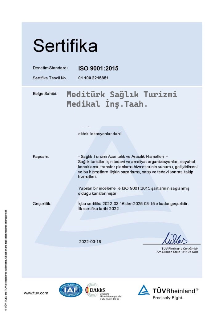 Meditürk Sağlık Turizmi şirketimiz uluslararası bir medikal turizm şirketidir. Memnuniyet odaklı sağlık turizmi acentesi olarak Meditürk, yüksek kalite standartlarında hizmet anlayışı ile sektörde fark yaratmayı hedeflemektedir.
